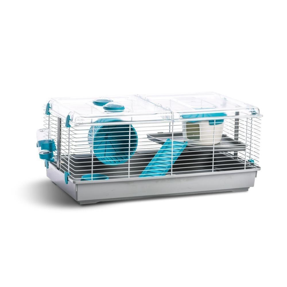 Hamsterbur Trudy fra firmaet MPS2. Hamsterbur med tremmer i metal og plastbund. Top i plastik med låge. Med hule, platform, stige, madskål, drikkeflaske og løbehjul i plast.